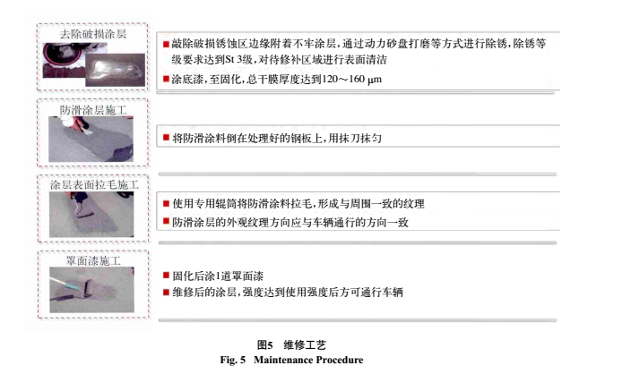 在防滑涂層的使用壽命周期內,如果因各種原因出現局部破損,可通過簡單的現場修補實現修復,施工工序如圖5所示。